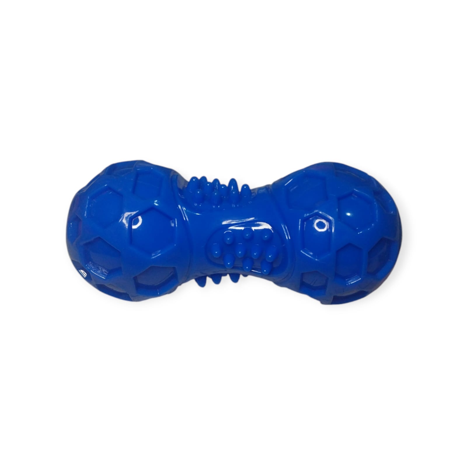 Brinquedo em formato de halter, com aproximadamente 15 cm, disponível nas cores azul ou vermelha. Possui apito interno que estimula a brincadeira e é de difícil remoção pelo cão, aumentando a durabilidade. Fabricado em material atóxico, seguro para seu pet.