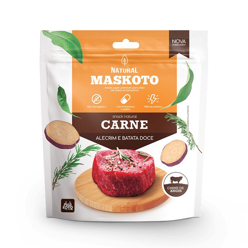 O Bifinho Para Cães Maskoto Carne, Alecrim e Batata Doce apresenta alto teor de proteina, prebióticos e zeólita, estimulando o equilibrio da flora intestinal.